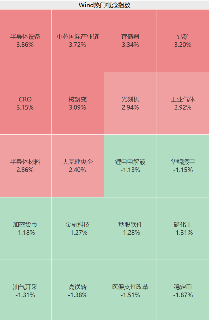 盘面上,半导体、发电设备、生物科技、文化传媒等板块走高,存储器、核聚变、CRO、光刻机等概念股火热;券商、炒股软件、油气开采等概念股回调。