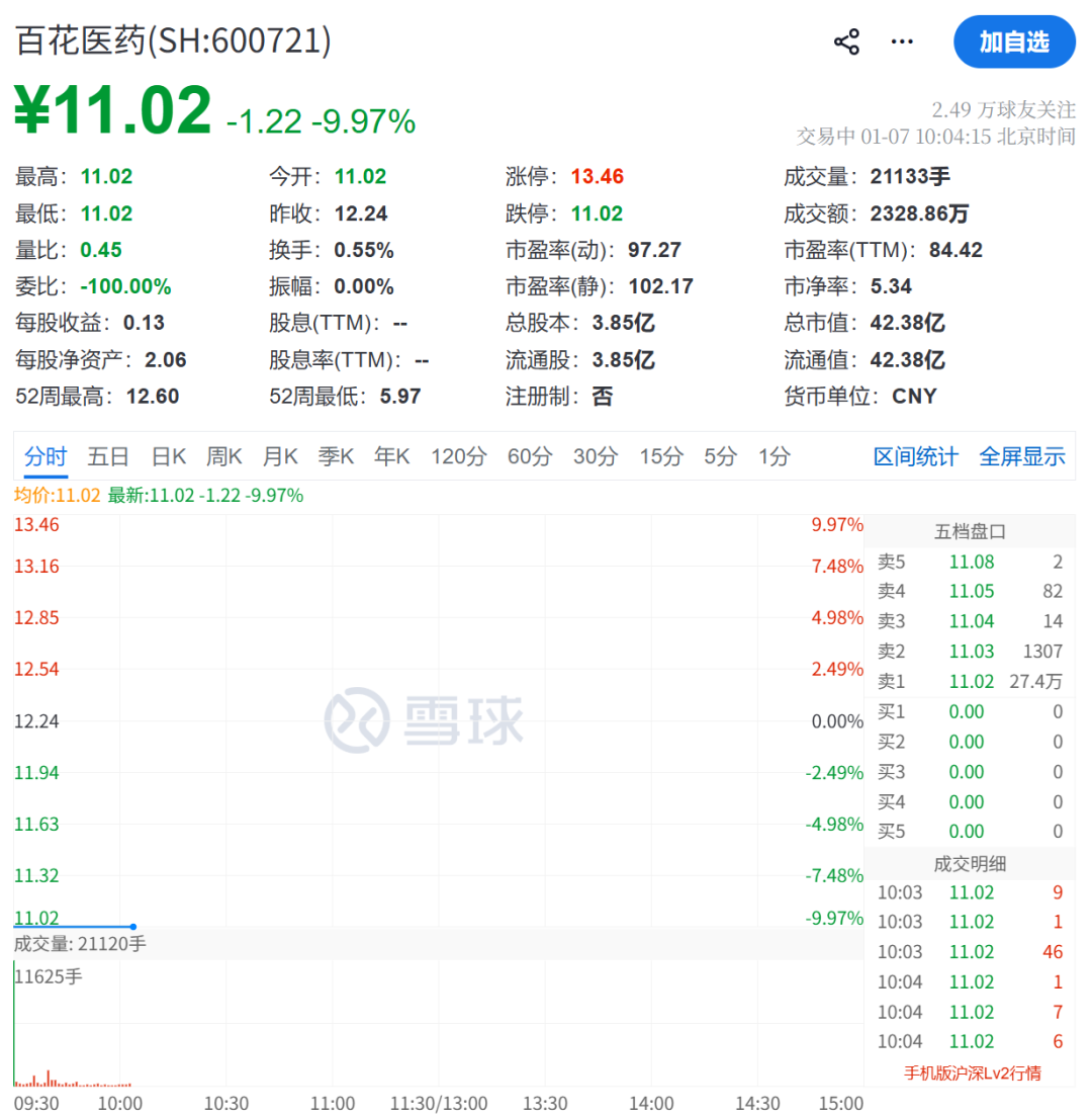 1月7日,百花医药正式复牌,在竞价阶段即跌停,报11.02元/股,跌幅为9.97%。截至发稿,百花医药仍保持跌停状态,卖一超27万手。