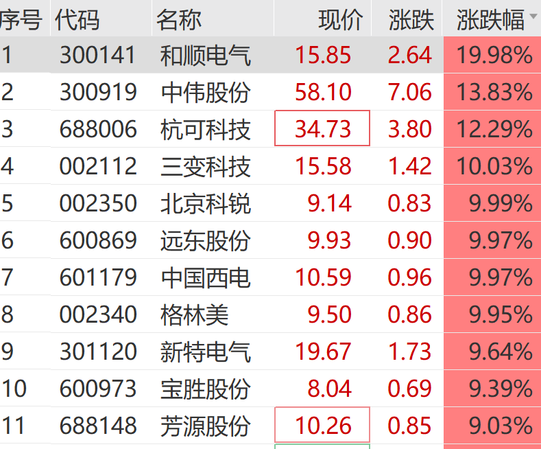 1月7日上午,电力设备板块盘中拉升,和顺电气走出20cm涨停,三变科技、远东股份、中国西电、格林美等多股涨停,中伟股份、新特电气等大涨。