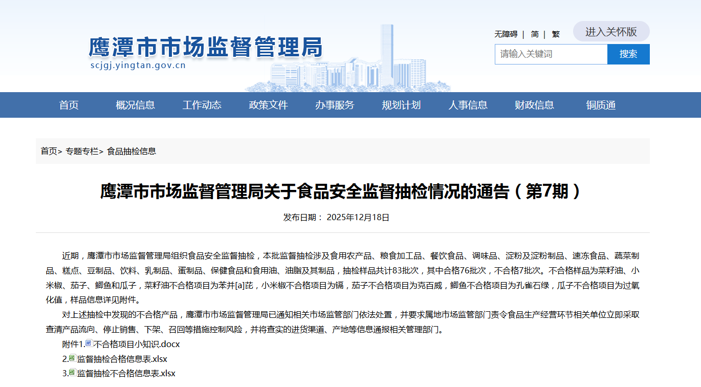 近期,鹰潭市市场监督管理局组织食品安全监督抽检,本批监督抽检涉及食用农产品、粮食加工品、餐饮食品、调味品、淀粉及淀粉制品、速冻食品、蔬菜制品、糕点、豆制品、饮料、乳制品、蛋制品、保健食品和食用油、油脂及其制品,抽检样品共计83批次,其中合格76批次,不合格7批次。不合格样品为菜籽油、小米椒、茄子、鲫鱼和瓜子,菜籽油不合格项目为苯并[a]芘,小米椒不合格项目为镉,茄子不合格项目为克百威,鲫鱼不合格项目为孔雀石绿,瓜子不合格项目为过氧化值,样品信息详见附件。