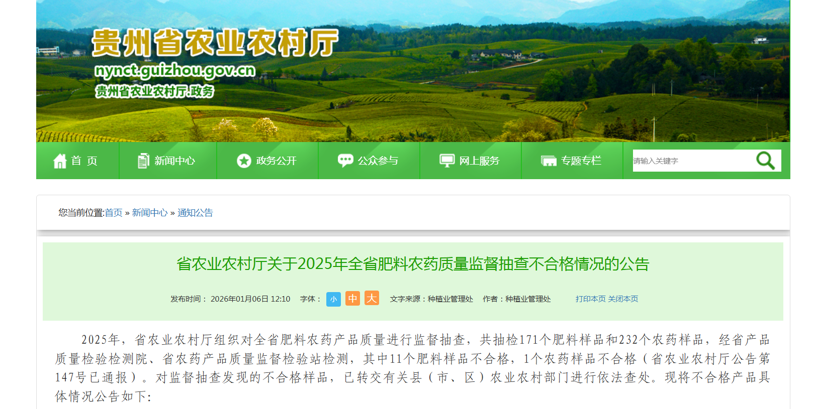 中国质量新闻网讯 近日,贵州省农业农村厅网站发布2025年全省肥料农药质量监督抽查不合格情况公告。