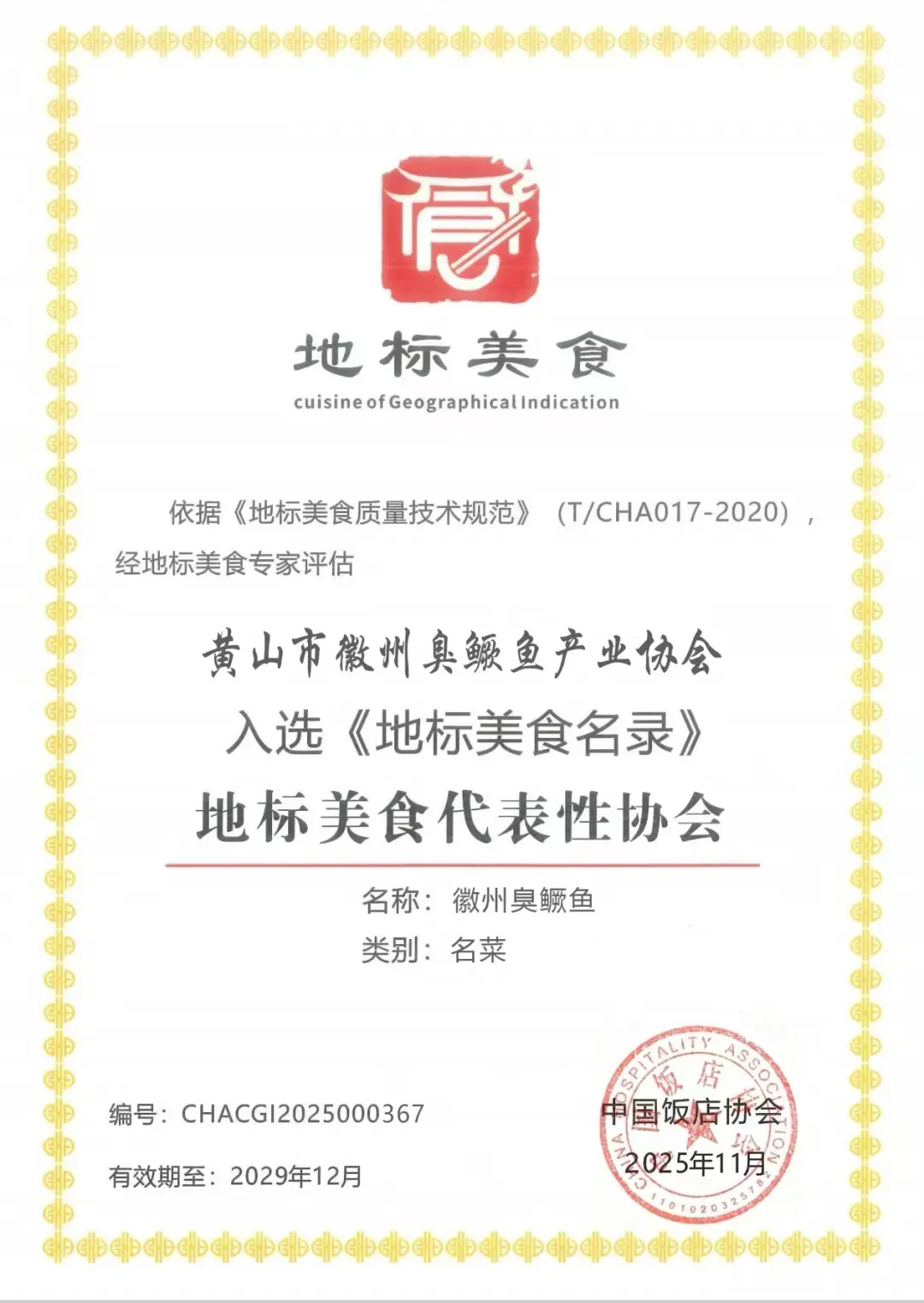 ★11月,黄山市徽州臭鳜鱼产业协会成功入选《地标美食名录》,被中国饭店协会认定为“地标美食代表性协会”。