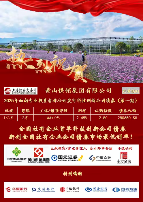 ★11月19日,发行1亿元科技创新债券,为全国供销合作社系统首单科技创新债券,同时填补了黄山市科技创新公司债券的市场空白,实现了区域金融品种的重要突破。