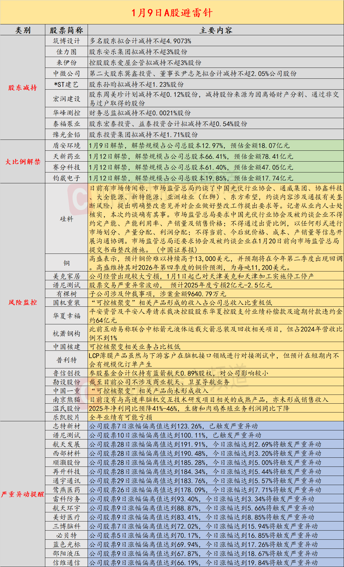 导读:财联社1月9日投资避雷针,近日,A股及海外市场潜在风险事件如下。国内经济信息方面包括:1)国内商品期市夜盘收盘多数下跌,黑色系跌幅居前;2)市场监管总局约谈6家光伏龙头及行业协会,不得约定产能及销售价格等;公司方面重点关注包括:1)4连板美克家居公告,公司经营出现较大亏损,1月1日起已对天津美克和天津加工实施停工停产;2)20CM四天三板谱尼测试股票交易严重异常波动, 预计2025年度亏损2亿元-2.5亿元;海外市场重点关注包括:1)美股三大指数收盘涨跌不一,存储概念普跌;2)高盛预计铜价难以持续高于13,000美元,二季度或出现回调。