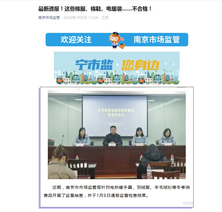 近期,南京市市场监管局针对电热暖手器、羽绒服、羊毛绒衫等冬季消费品开展了监督抽查,并于1月6日通报监督检查结果。