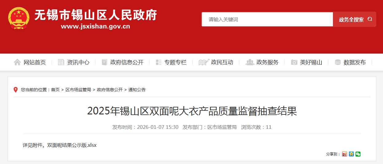 中国质量新闻网讯 近日,江苏省无锡市锡山区人民政府网站公布2025年锡山区双面呢大衣产品质量监督抽查结果。