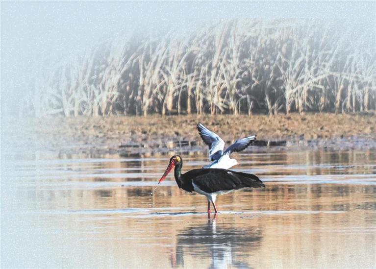 黑河湿地的“明星候鸟”,当数灰鹤。每年初冬,都会有上千只灰鹤从西伯利亚飞来,在这里越冬。灰鹤的体形高大,羽毛呈灰褐色,长长的双腿在浅水中行走时格外稳健,头顶前部的红色裸区是它们最显著的标志。