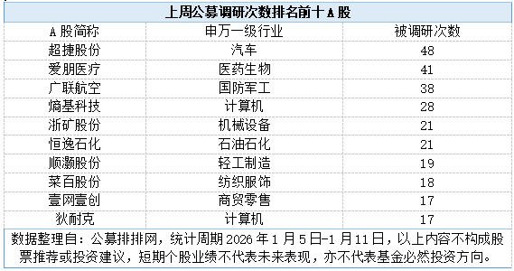 新华财经上海1月12日电(林郑宏) 2026年开年,公募加快调研步伐。据公募排排网数据显示,上周(2026年1月6日-1月11日)141家公募机构参与到A股调研活动中,覆盖到24个申万一级行业中的111只个股,合计调研次数达673次,调研次数明显高于常规周度水平。