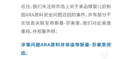 而此次涉事的ARA原料到底是谁生产的呢?作为高端婴幼儿配方奶粉中的核心添加成分,ARA供应商主要集中在荷兰皇家帝斯曼集团和中国嘉必优生物技术公司。在召回事件发生后,帝斯曼迅速发布“严正声明”,明确指出涉事问题ARA原料并非由其供应。