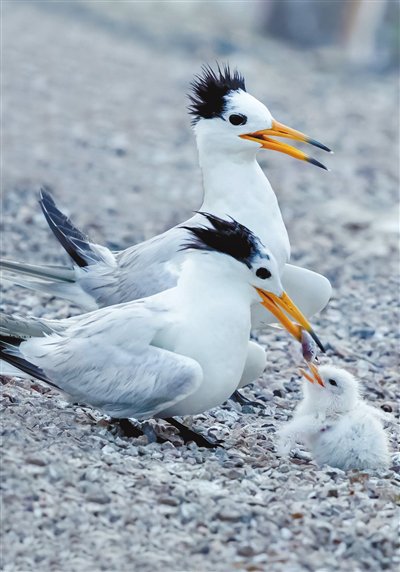 当“社群吸引技术”成功招引燕鸥后,陈水华没有止步,而是开始研究中华凤头燕鸥与大凤头燕鸥的杂交问题。“保护不能只讲数量,还要守护物种的独特性。”他与中山大学的研究团队合作,通过基因检测追踪种群纯度,这种超越了“生存本能”的追求,正是艺术精神在科学中的体现。