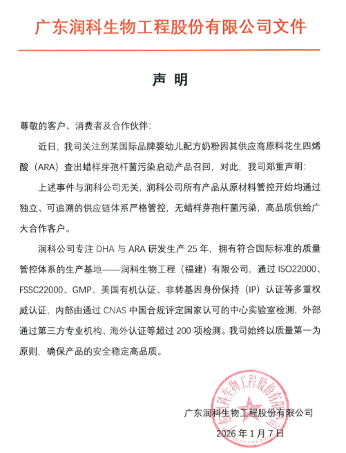 同日,广东润科生物工程股份有限公司也发布声明称,召回事件与润科公司无关,润科公司所有产品从原材料管控开始均通过独立、可追溯的供应链体系严格管控,无蜡样芽孢杆菌污染。