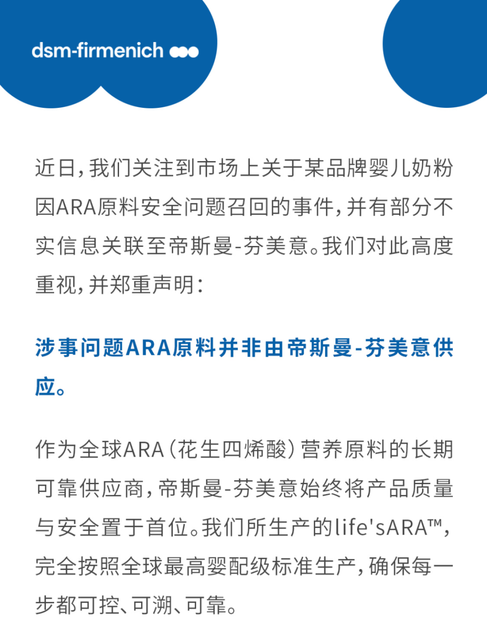 帝斯曼-芬美意人类营养与关爱事业部的官方公众号“帝斯曼芬美意营养365”发布声明《严正声明:近日涉事问题ARA原料并非由帝斯曼-芬美意供应》的截图。