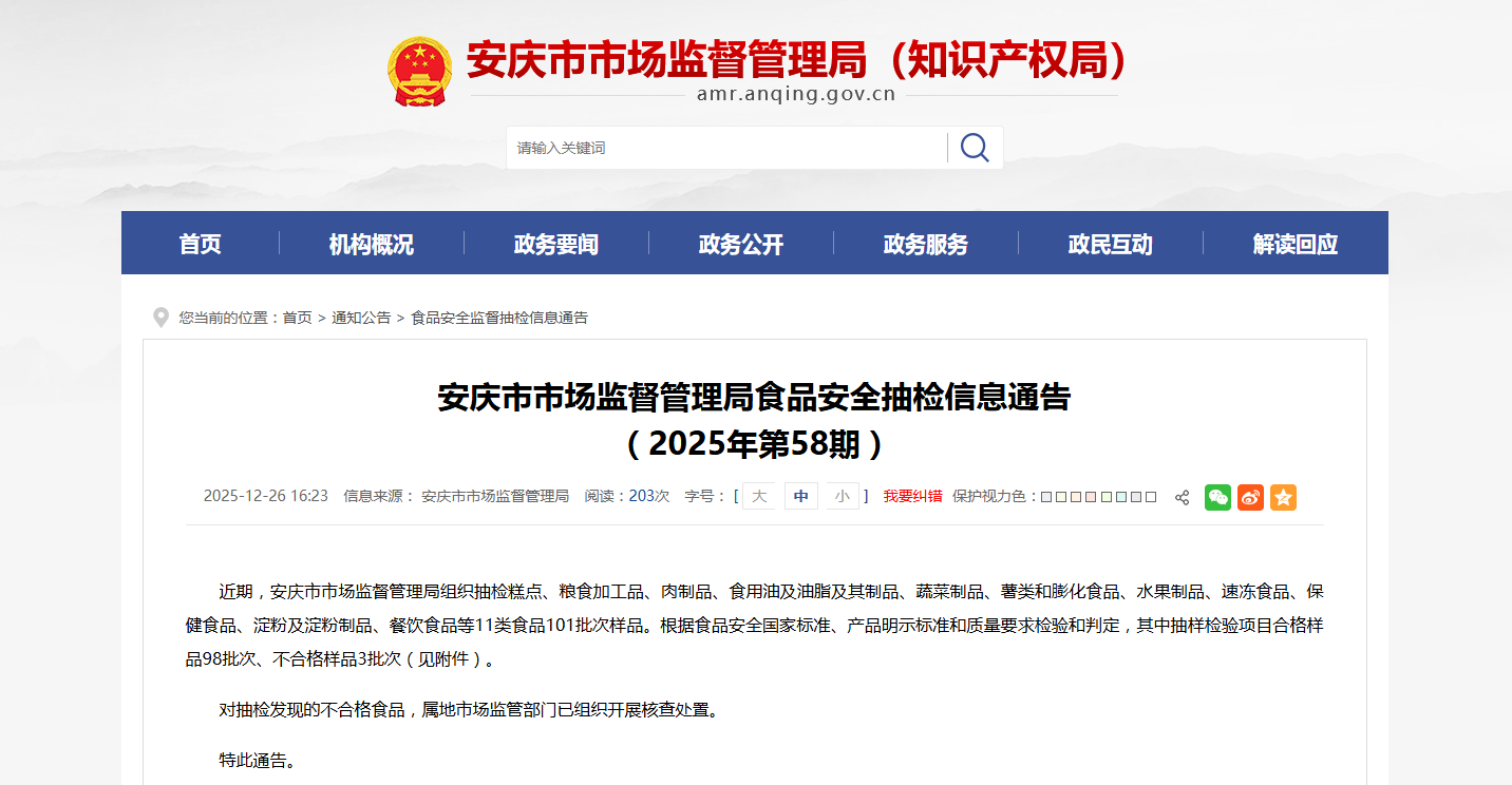 近期,安庆市市场监督管理局组织抽检糕点、粮食加工品、肉制品、食用油及油脂及其制品、蔬菜制品、薯类和膨化食品、水果制品、速冻食品、保健食品、淀粉及淀粉制品、餐饮食品等11类食品101批次样品。根据食品安全国家标准、产品明示标准和质量要求检验和判定,其中抽样检验项目合格样品98批次、不合格样品3批次(见附件)。