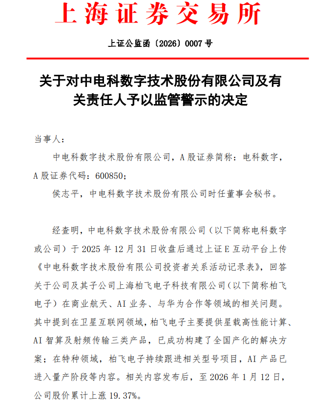 1月13日晚间,上交所发布关于对电科数字(600850.SH)及有关责任人予以监管警示的决定。当前市场对于“商业航天”“卫星”“AI应用”等相关概念高度关注,对公司股价和投资者决策可能产生较大影响,公司发布相关信息尤其应当审慎、准确、客观,并充分提示不确定性风险,避免对投资者产生误导。公司在投资者关系活动记录表中披露的内容未能准确反映公司卫星通信产品、AI产品的发展阶段、销售规模及对公司整体经营情况的影响,也未就未来发展存在的不确定性等情况充分提示风险,经监管督促才发布公告予以说明,信息披露不准确、不完整,风险提示不充分,可能对投资者决策产生误导。