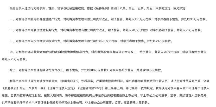 综合来看,针对挪用私募基金财产、开展资金池业务、承诺收益、信披不合规的四大违规事实,该局决定对利得资本责令改正,给予警告,并罚款310万元;对李兴春给予警告,并罚款93万元。