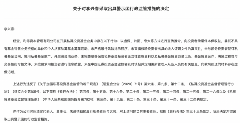 7个月前,山东证监局已向利得资本及实控人李兴春采取行政监管措施,同时通过罚单披露了该私募存在的十二项违规行为: