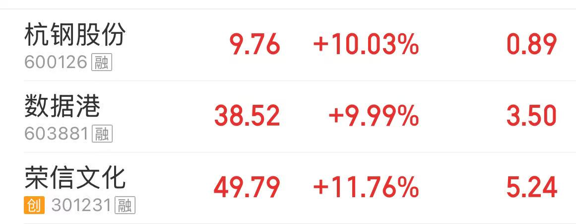 杭钢股份,数据港涨停,荣信文化涨超11%。