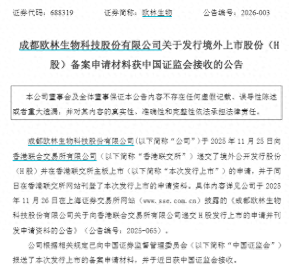 根据公告,欧林生物已于2025年11月25日向香港联交所递交申请,并于同日在联交所网站刊登了发行上市申请资料。公司同步向中国证监会报送了备案申请材料并获接收。不过,公司方面强调,本次发行上市尚需取得中国证监会、香港证监会及香港联交所等相关监管机构的批准,仍存在不确定性。
