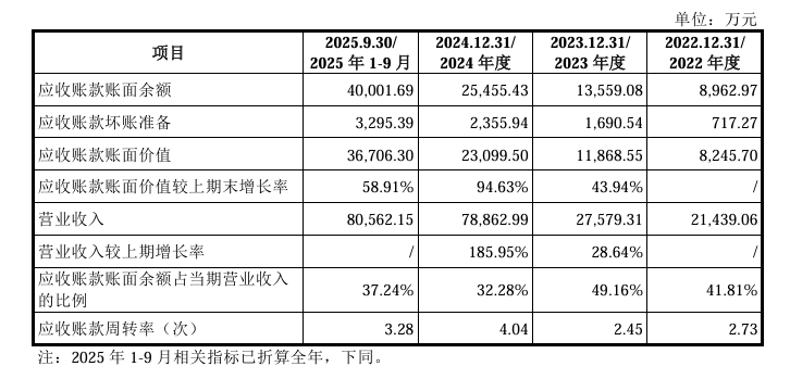 此外,联讯仪器应收账款问题较为突出。上述同期,其应收账款的账面余额分别为8962.97万元、1.36亿元、2.55亿元和4亿元,占当期营业收入的比例分别为41.81%、49.16%、32.28%和37.24%。2022年至2025年前三季度,公司逾期应收账款金额由2743.99万元增至1.15亿元。坏账准备同步扩大,同期应收账款坏账准备金额由717.27万元增至3295.39万元。上交所要求该公司说明逾期应收账款的账龄情况、相关坏账准备计提的充分性。