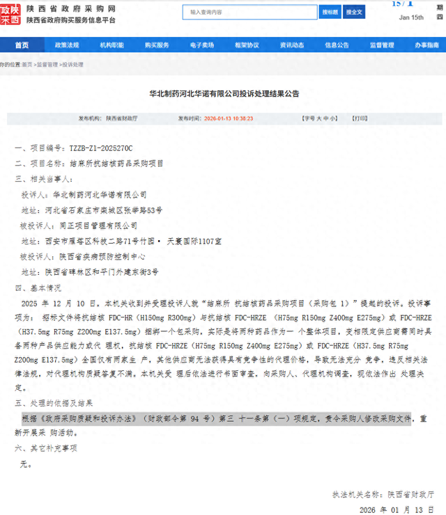 公告中显示,华北制药河北华诺有限公司就“结麻所抗结核药品采购项目”,对陕西省疾病预防控制中心及同正项目管理有限公司提起投诉。