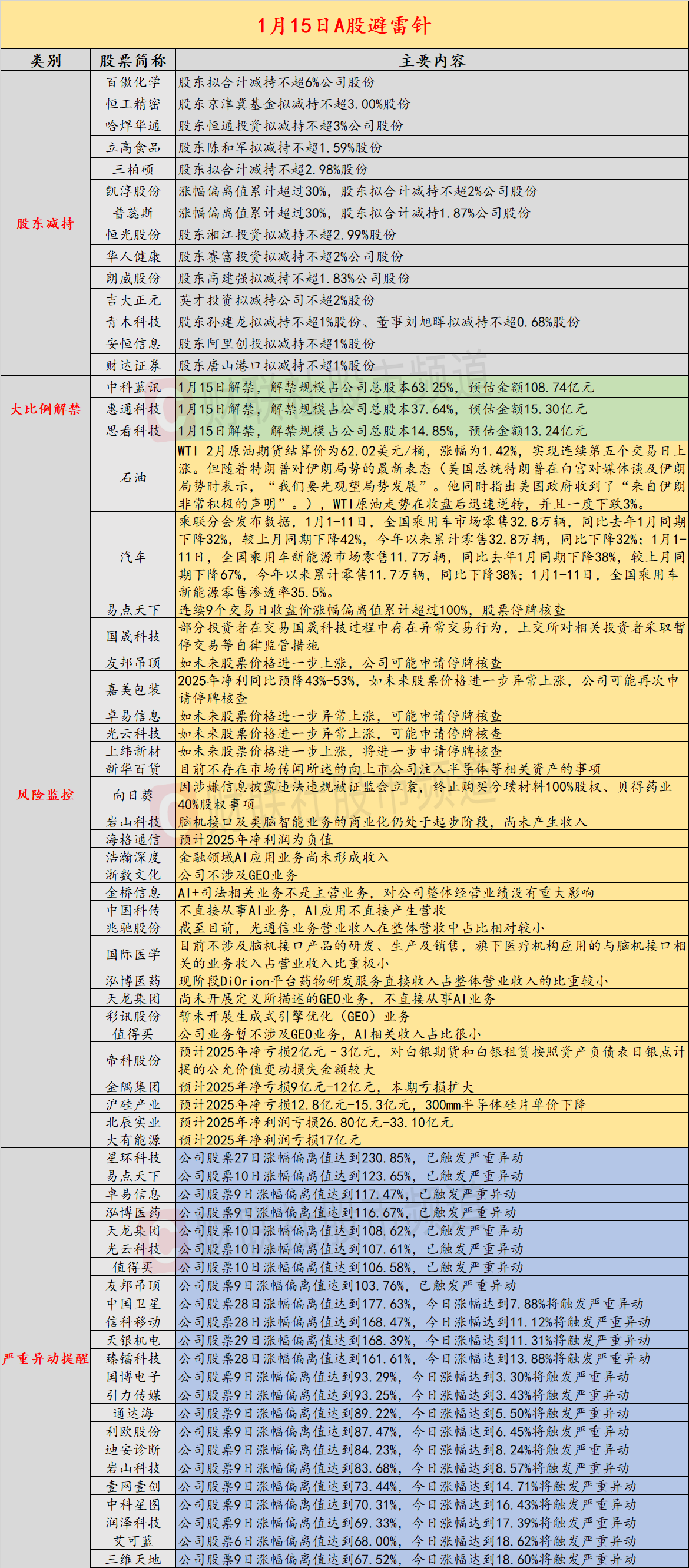 导读:财联社1月15日投资避雷针,近日,A股及海外市场潜在风险事件如下。国内经济信息方面包括:1)目前个别大中型券商的两融资金已用完;2)市场监管总局对携程立案调查;公司方面重点关注包括:1)易点天下连续9个交易日收盘价涨幅偏离值累计超过100%,股票停牌核查;2)部分投资者在交易国晟科技过程中存在异常交易行为,上交所对相关投资者采取暂停交易等自律监管措施;海外市场重点关注包括:1)美股三大指数集体收跌,纳指收跌1%;2)特朗普“口头降温”伊朗局势,国际油价应声跳水。