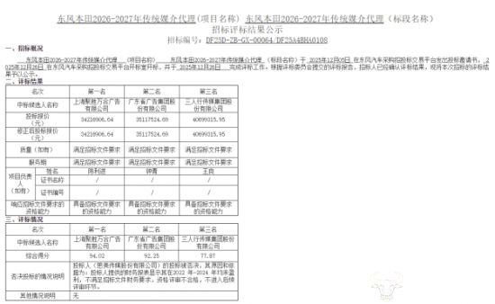 日前,“东风本田2026-2027年传统媒介代理”中标结果出炉。值得注意的是,前不久东风本田刚花了7000多万采购公关传播代理服务,这意味着东风本田已经花费1亿多采购媒体投放和公关服务!