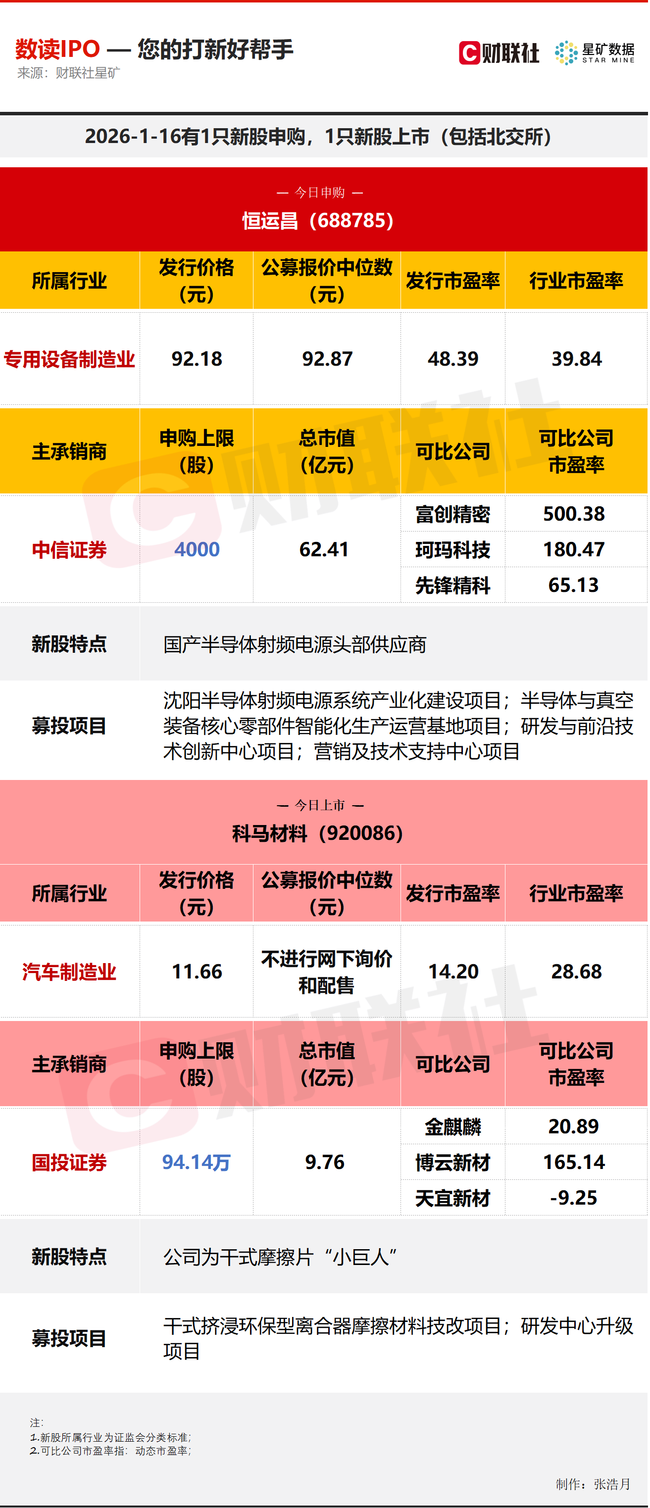财联社1月16日讯,今日有1只新股申购,为科创板的恒运昌,1只新股上市,为北交所的科马材料。