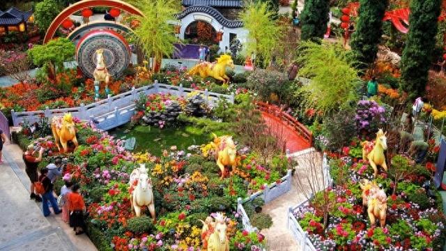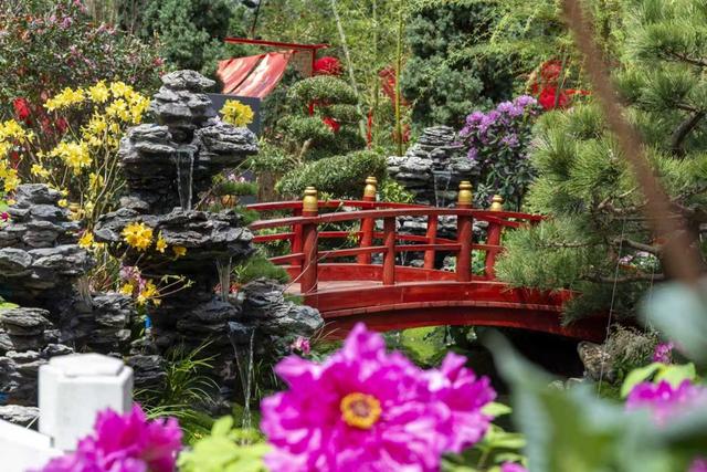 花展主景区的折桥流水演绎“鞍虹叠水”,拱桥如鞍,跨水成虹,寓意“鞍”(安)居乐业、“水”(岁)岁安康。