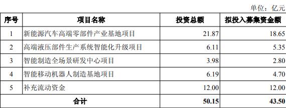 公司拟向不特定对象发行A股可转换公司债券募集资金总额不超过43.50亿元(含),扣除发行费用后的募集资金净额拟投资于新能源汽车高端零部件产业基地项目、高端液压部件生产系统智能化升级项目、智能制造全场景研发中心项目、智能移动机器人制造基地项目、补充流动资金。