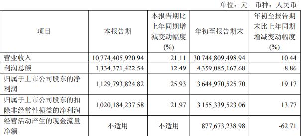 年初至报告期末,公司实现营业收入307.45亿元,同比增长10.44%;归属于上市公司股东的净利润36.45亿元,同比增长19.17%;归属于上市公司股东的扣除非经常性损益的净利润为31.55亿元,同比增长13.77%;经营活动产生的现金流量净额8.78亿元。