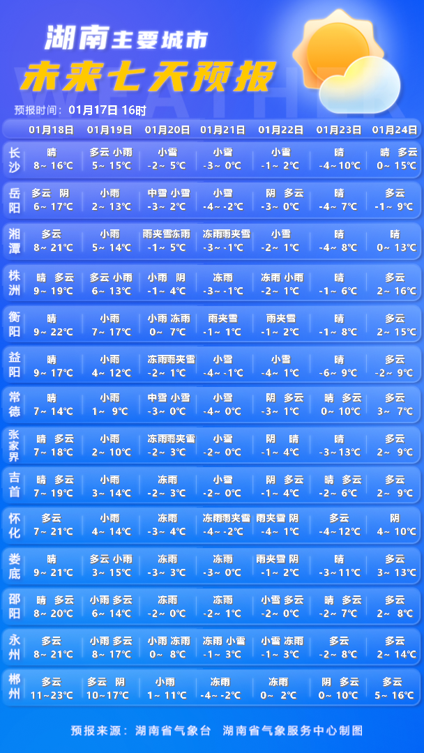 19日晚上至20日白天,湘中及以北小雨转雨夹雪、冻雨、雪,其中湘西州北部、怀化北部、张家界、常德、益阳部分地区中到大雪,局地暴雪,其他地区阴天有小雨;北风5~6级,局地阵风7~9级;最低气温湘中及以北-2~0℃,其他地区1~2℃;最高气温湘中及以北-1~2℃,其他地区3~6℃。