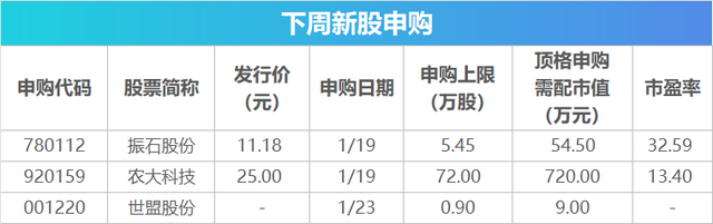 具体来看,振石股份、农大科技将于1月19日开启申购,振石股份申购代码为780112,发行价为11.18元/股,农大科技申购代码为920159,发行价为25.00元/股。世盟股份将于1月23日开启申购,申购代码为001220。