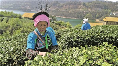 茶农在都匀市毛尖镇高寨水库茶园采摘茶叶。贵阳银行累计为都匀茶产业发放贷款4000万元。