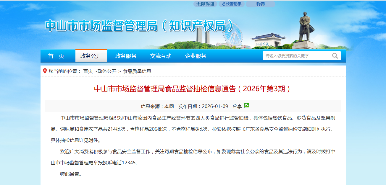 中山市市场监督管理局组织对中山市范围内食品生产经营环节的四大类食品进行监督抽检,具体包括餐饮食品、炒货食品及坚果制品、调味品和食用农产品共214批次,合格样品206批次,不合格样品8批次。检验依据按照《广东省食品安全监督抽检实施细则》执行。具体抽检信息详见附件。