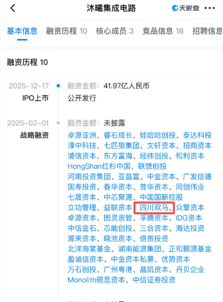 以沐曦股份为例,根据天眼查,该公司上市前最后一轮战略融资出现上市公司四川双马身影。四川双马最初以水泥生产为主业,现已转型为建材生产、私募股权投资基金管理与生物医药研发并行的多元化企业。该公司2025年三季度业绩报告显示,2025年前三季度公司实现营业收入9.17亿元,同比增长23.21%;归母净利润2.94亿元,同比增长20.03%。根据国金证券研报,四川双马投资项目包括奇瑞汽车、文远知行、小鹏汽车、小马智行、沐曦股份等。其中,文远知行同样位列上述中国人工智能企业50强榜单。