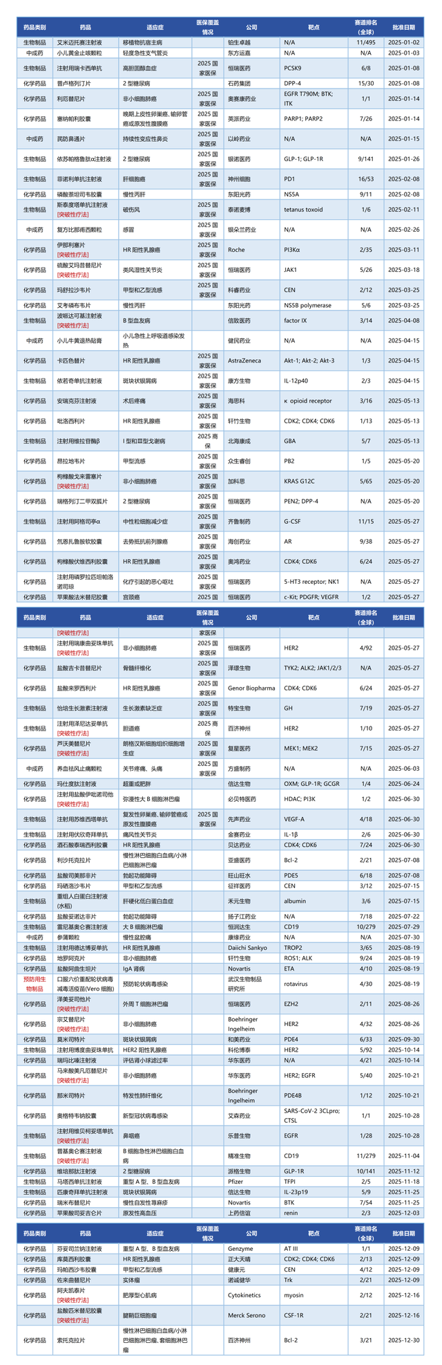 国家医保弥补保障空白的努力,不仅体现在对于上述“缺药少药”的罕见疾病的覆盖上,即便是对于一些已经有相对较多治疗药物的乳腺癌、肺癌等大病种,当有革新性或者首创新的治疗手段问世后,也能及时纳入保障范围,为患者提供实惠。比如针对HR阳性乳腺癌的小分子PI3Kα抑制剂伊那利塞片(突破性疗法,全球赛道排名2/35)、针对HER2突变非小细胞肺癌的HER2单抗药物注射用瑞康曲妥珠单抗(突破性疗法,全球赛道排名4/92)、针对KRAS突变非小细胞肺癌的枸橼酸戈来雷塞片(突破性疗法,全球赛道排名5/65),这些2025年获批的创新药都是同靶点和适应症首次出现在国家医保目录之中。当然,对于基本医疗保障已经充分的领域,部分1类新药同样难以进入医保目录,也体现了国家医保局对差异化创新的态度。