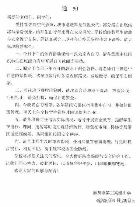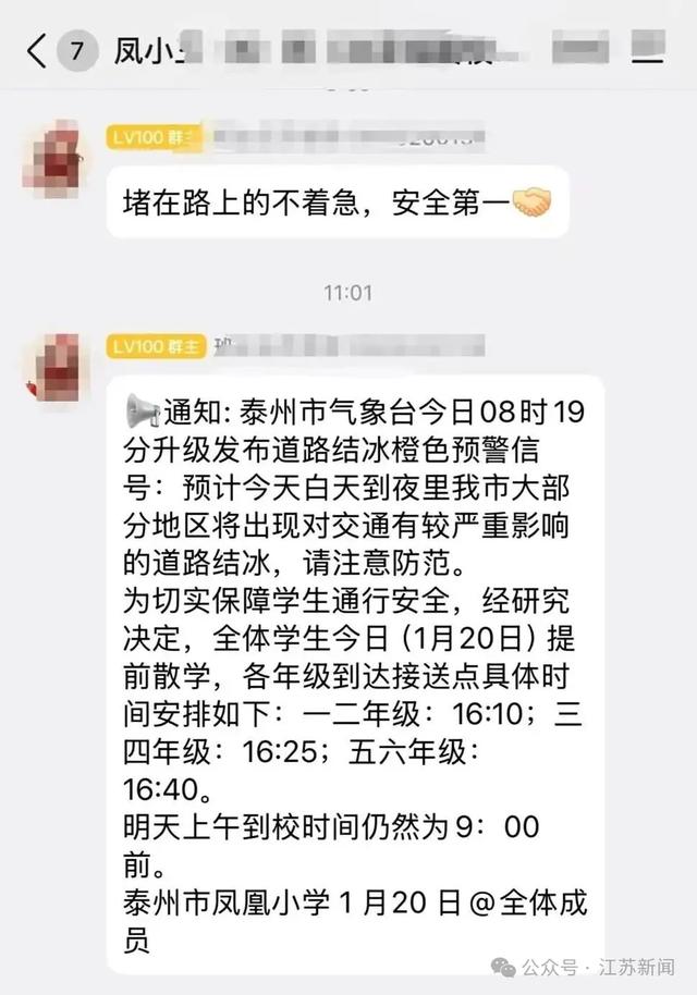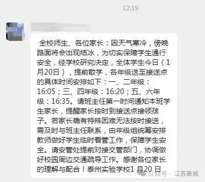 泰州多所学校通知提前放学