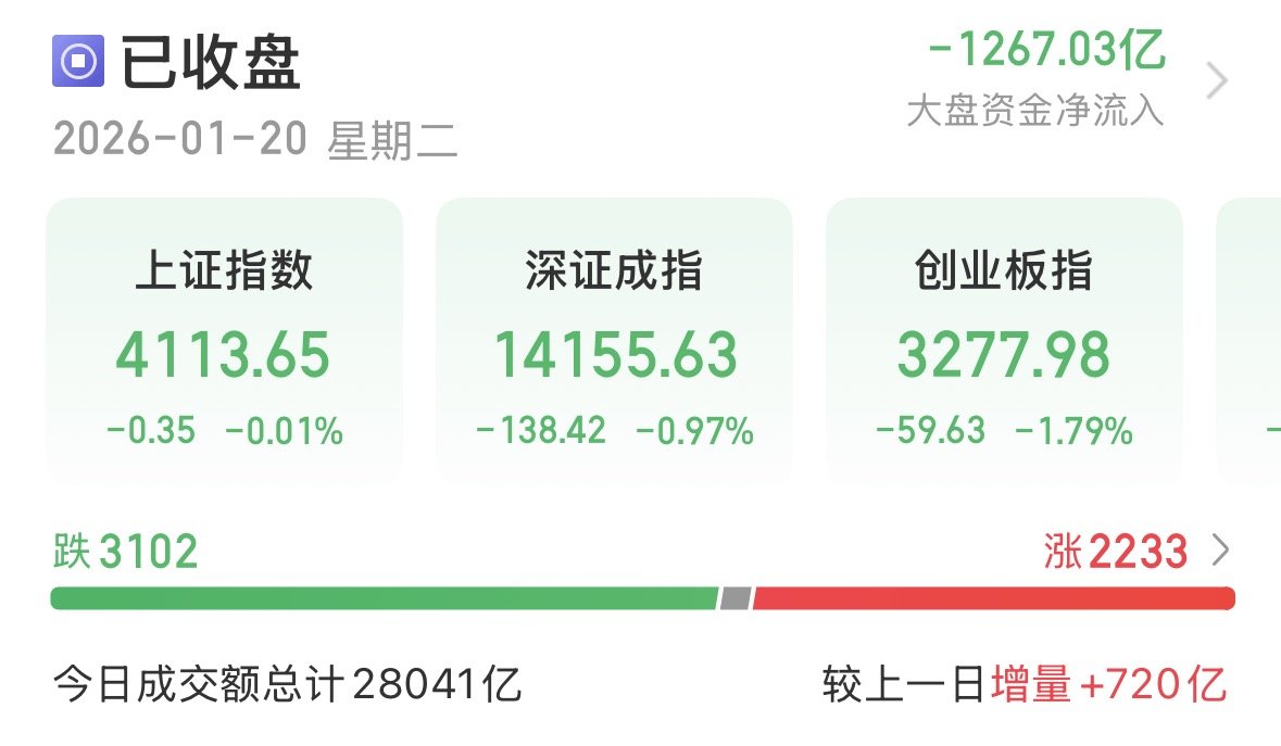 1月20日,A股三大指数集体调整。截至收盘,沪指跌0.01%,收报4113.65点;深证成指跌0.97%,收报14155.63点;创业板指跌1.79%,收报3277.98点。全市场全天成交额达到28041亿元,较昨日放量720亿元。个股上涨2233只,下跌3102只,投资者“喜忧参半”。