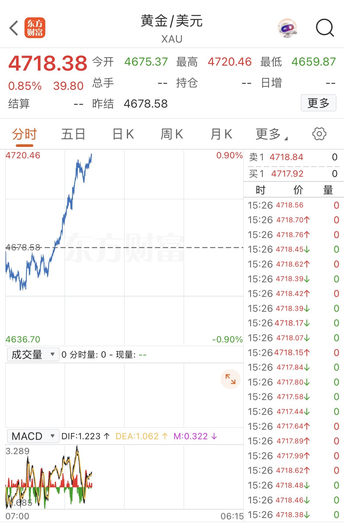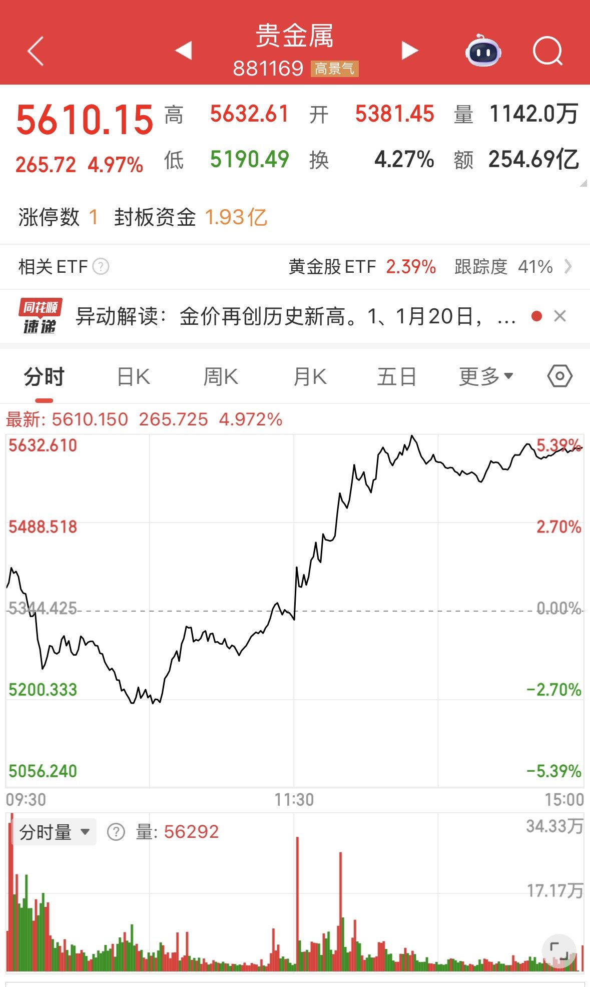 贵金属板块今日领涨市场,板块上涨近5%。招金黄金、湖南白银涨停,山金国际涨超8%。消息面上,受格陵兰岛紧张局势影响,现货黄金突破4700美元/盎司大关,再创历史新高。
