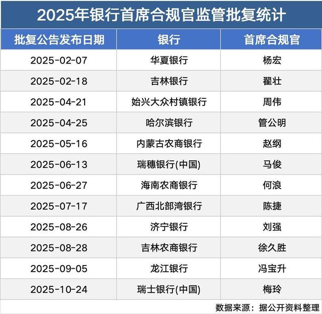 《金融机构合规管理办法》自2025年3月1日起施行。图片来源:金融监管总局官网根据规定,《办法》自2025年3月1日起施行,过渡期为施行之日起一年,目前已接近尾声。记者统计发现,2025年监管部门已批准同意十余家银行的首席合规官聘任,以中小银行为主。《办法》施行以来,银行领域首位获批的首席合规官为华夏银行的杨宏,始兴大众村镇银行的周伟则是首位获批的村镇银行首席合规官。