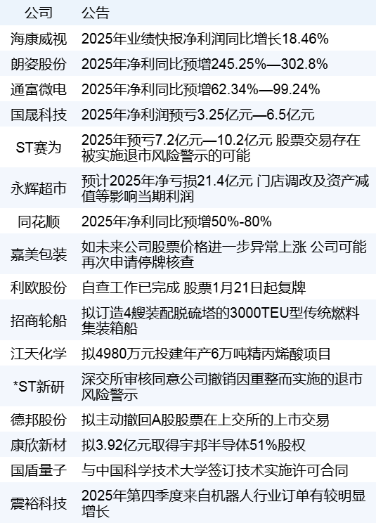 •德邦股份公告称,公司拟以股东会决议方式主动撤回A股股票在上交所的上市交易,并申请股票进入全国中小企业股份转让系统退市板块继续交易。公司股票于1月21日(明日)开市起停牌。德邦股份或将成为2026年A股首家主动退市的上市公司。(新华财经)