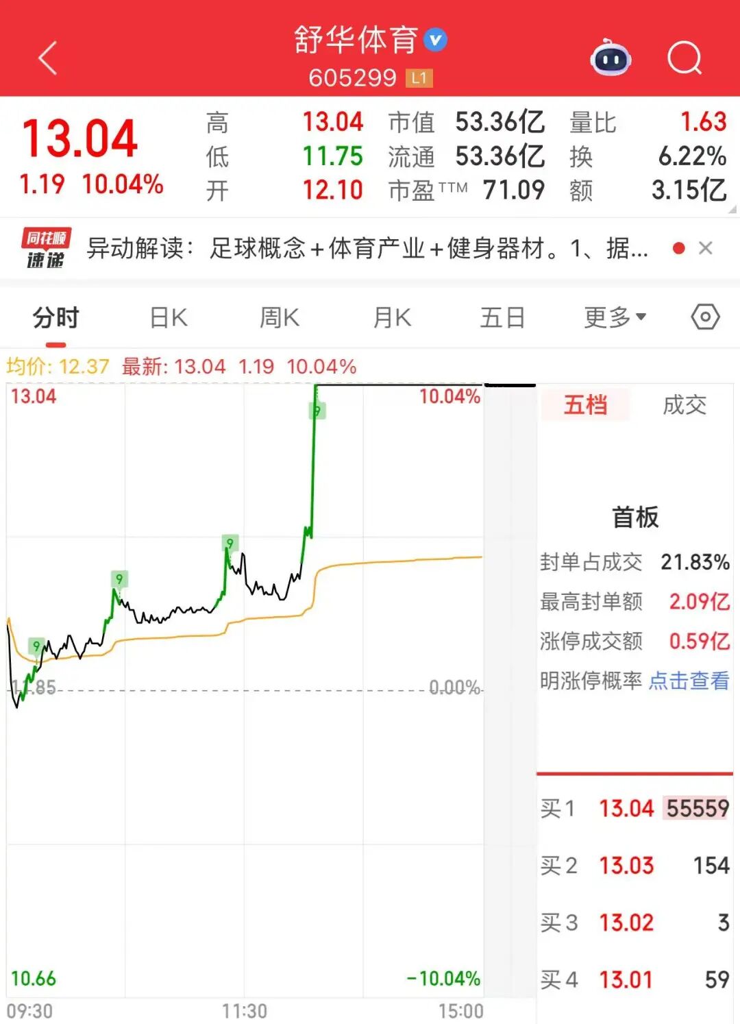 午后,体育产业股走强。舒华体育在2分钟内直线涨停,收盘报13.04元/股,最新市值为53.36亿元。