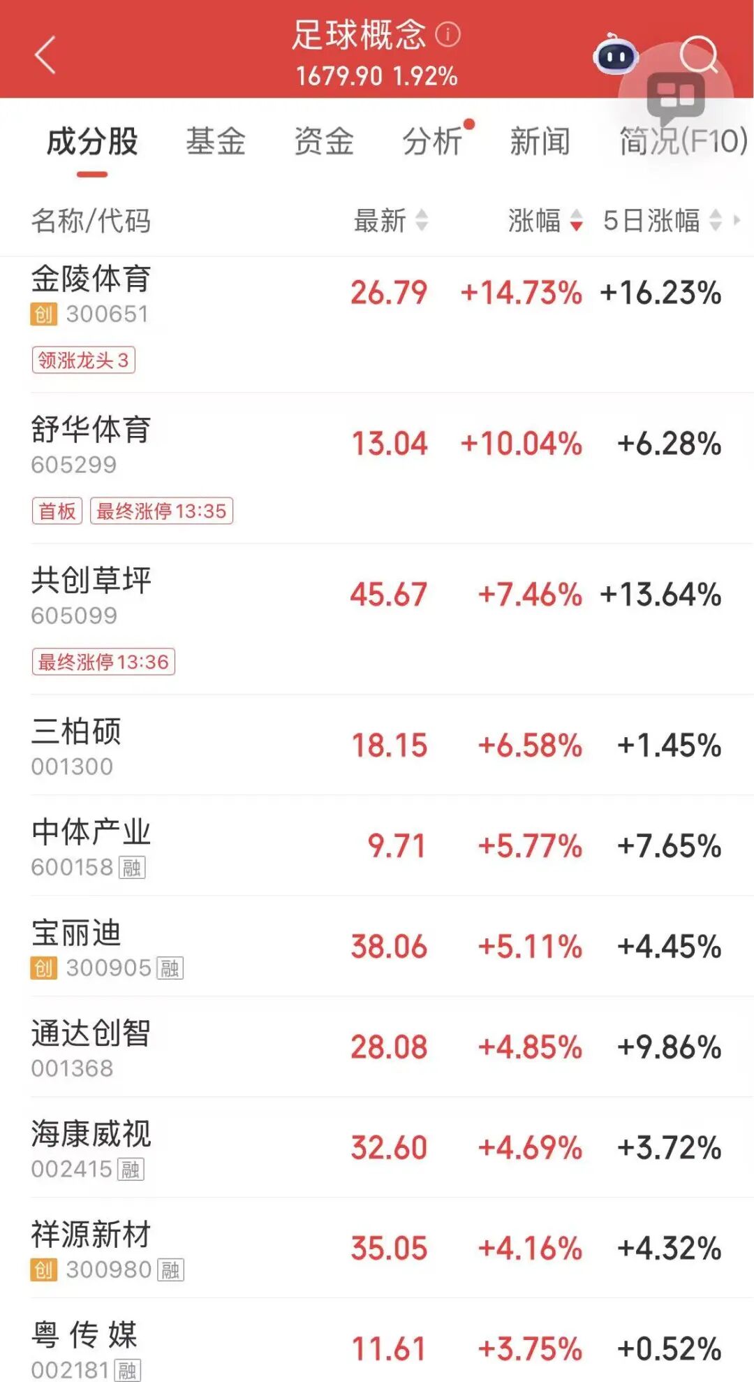 午后,体育产业股走强。截至收盘,金陵体育涨超14%,棕榈股份、舒华体育等涨停。