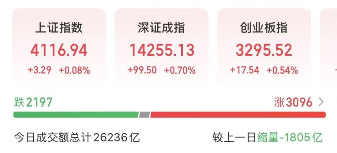 截至收盘,上证指数上涨0.08%,深证成指上涨0.7%,创业板指上涨0.54%。