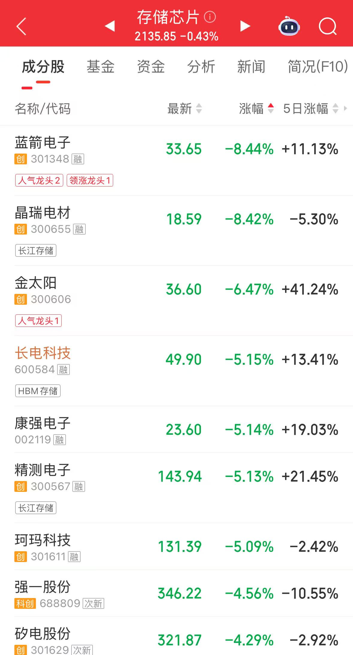1月22日早盘,存储芯片概念快速下跌,截至发稿,蓝箭电子(301348.SZ)一度跌逾10%,晶瑞电材(300655.SZ)、金太阳(GSUN.US)、精测电子(300567.SZ)、长电科技(600584.SH)等跟跌。