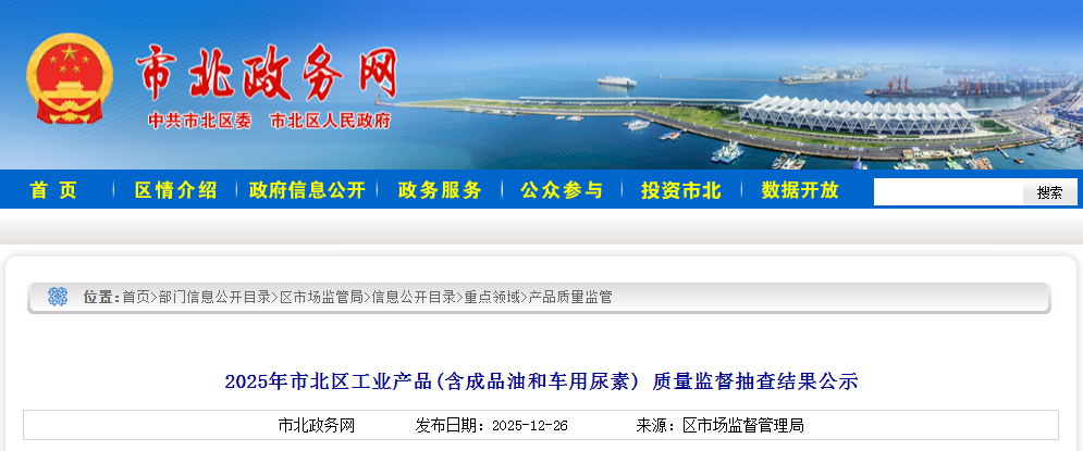 中国质量新闻网讯 据山东省青岛市市北区人民政府网站消息,根据《市北区重点工业产品质量安全监管目录(2025版)》,市北区市场监督管理局2025年对辖区工业产品(含成品油和车用尿素)开展了质量监督抽查工作。本年度共抽查工业产品(含成品油和车用尿素) 53类272批次,全部合格。