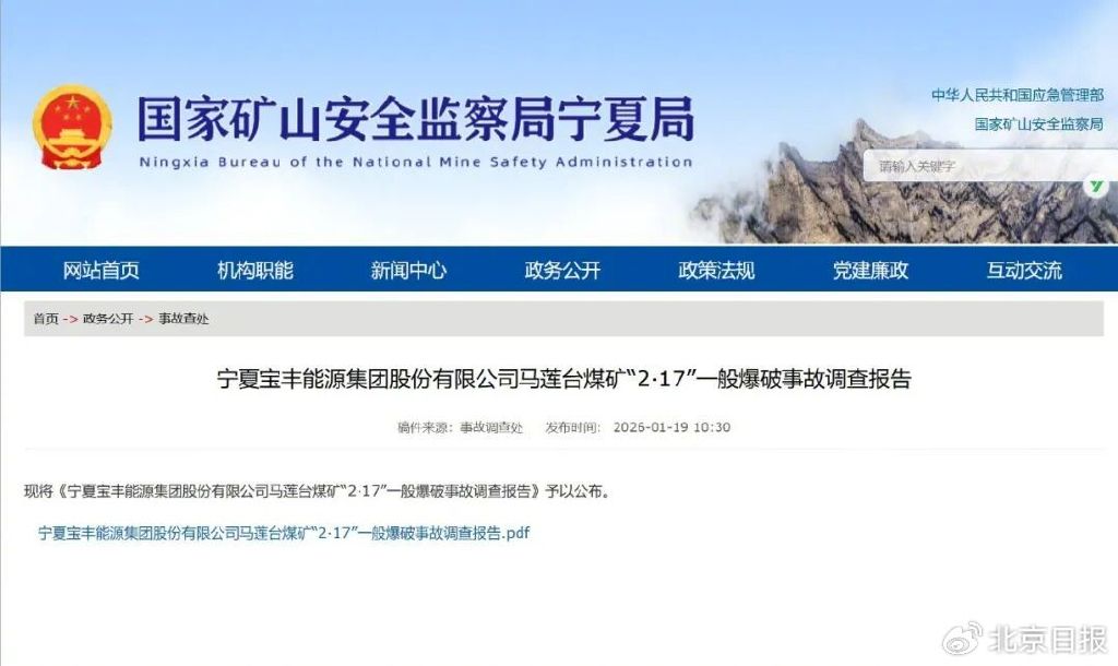 近日,国家矿山安全监察局宁夏局网站公布了《宁夏宝丰能源集团股份有限公司马莲台煤矿“2·17”一般爆破事故调查报告》。