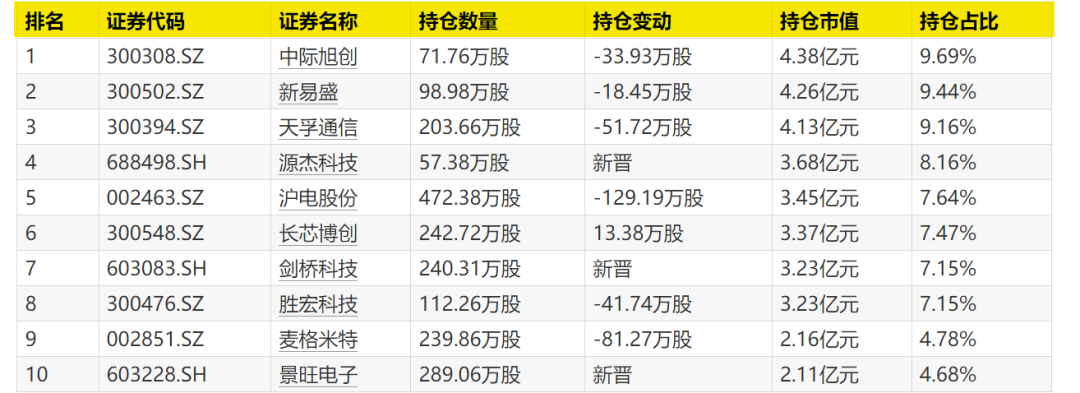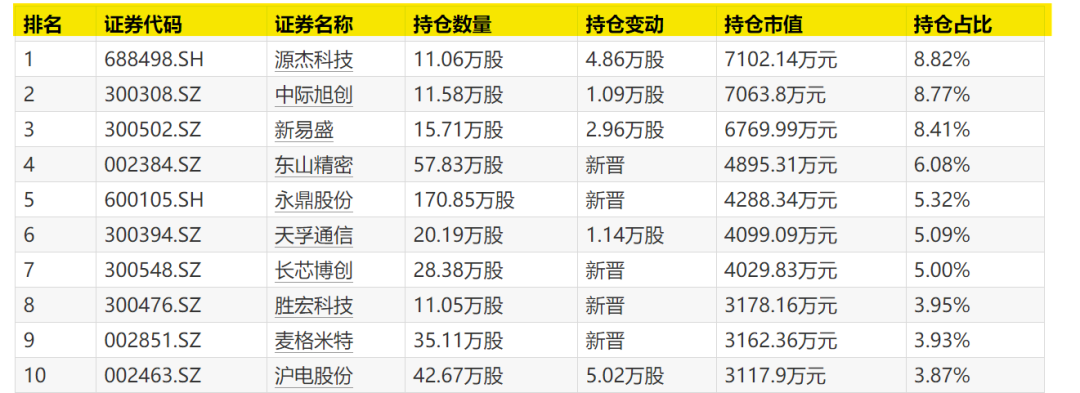 最新持仓显示,前三大重仓股为源杰科技、中际旭创、新易盛,持仓市值分别为7102.14万元、7063.80万元、6769.99万元。