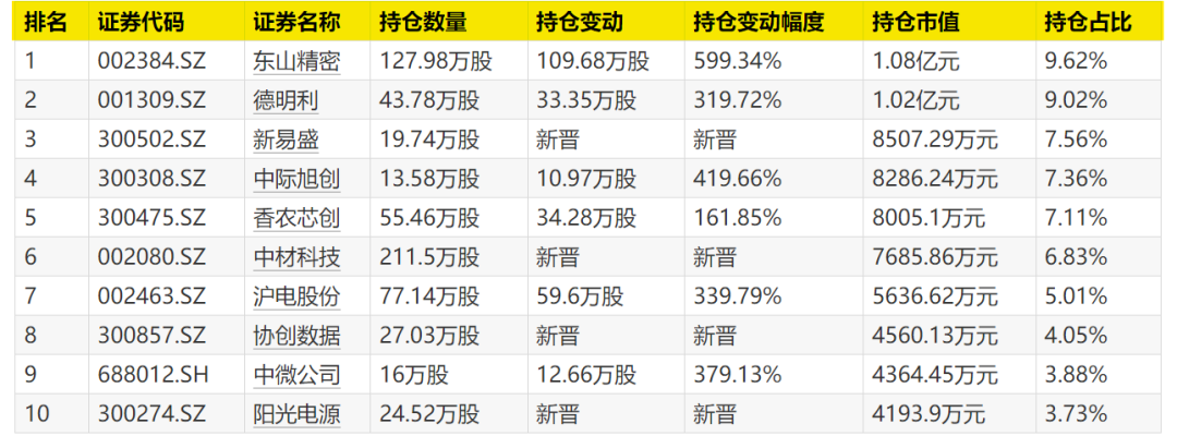新易盛、中材科技、协创数据、阳光电源新晋十大重仓股。