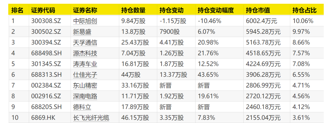 具体来看,前三大重仓股为中际旭创、新易盛、天孚通信,持仓市值分别为6002.40万元、5945.28万元、5163.78万元。